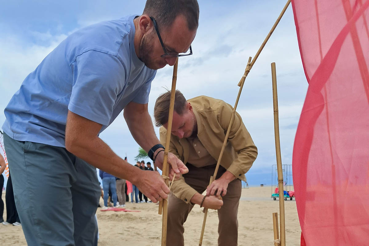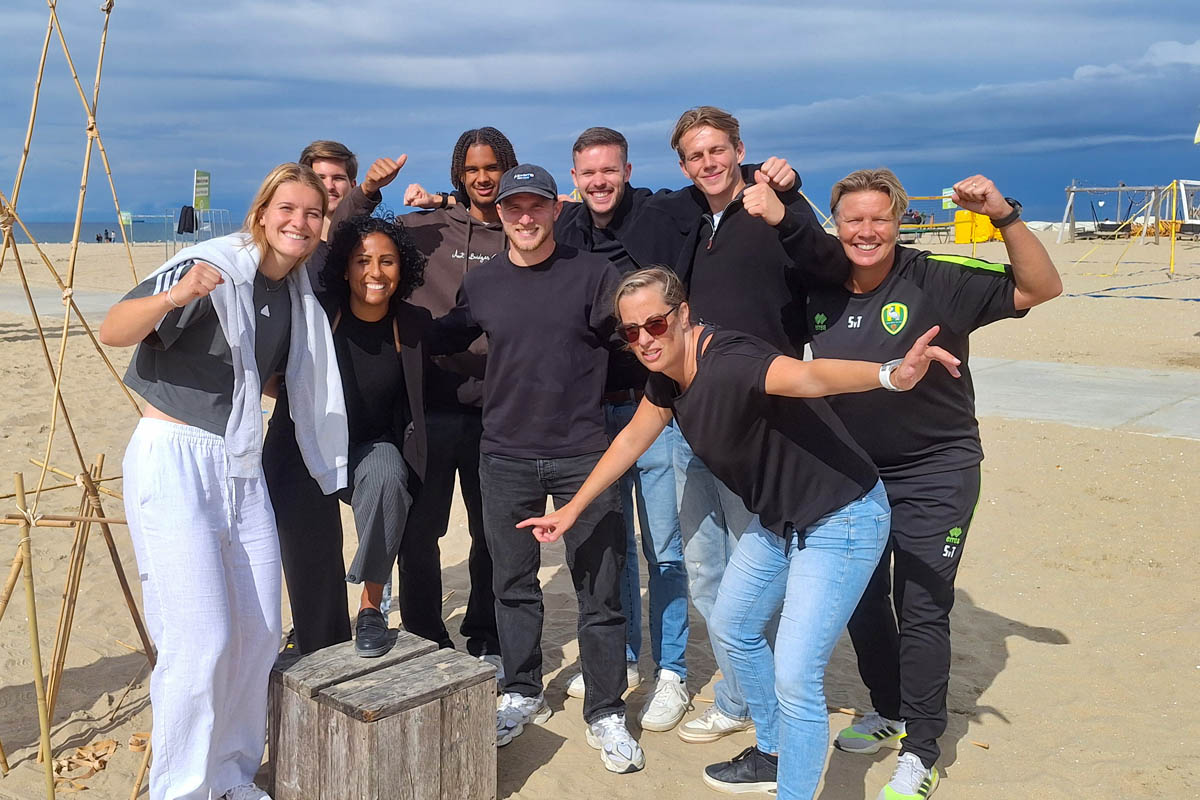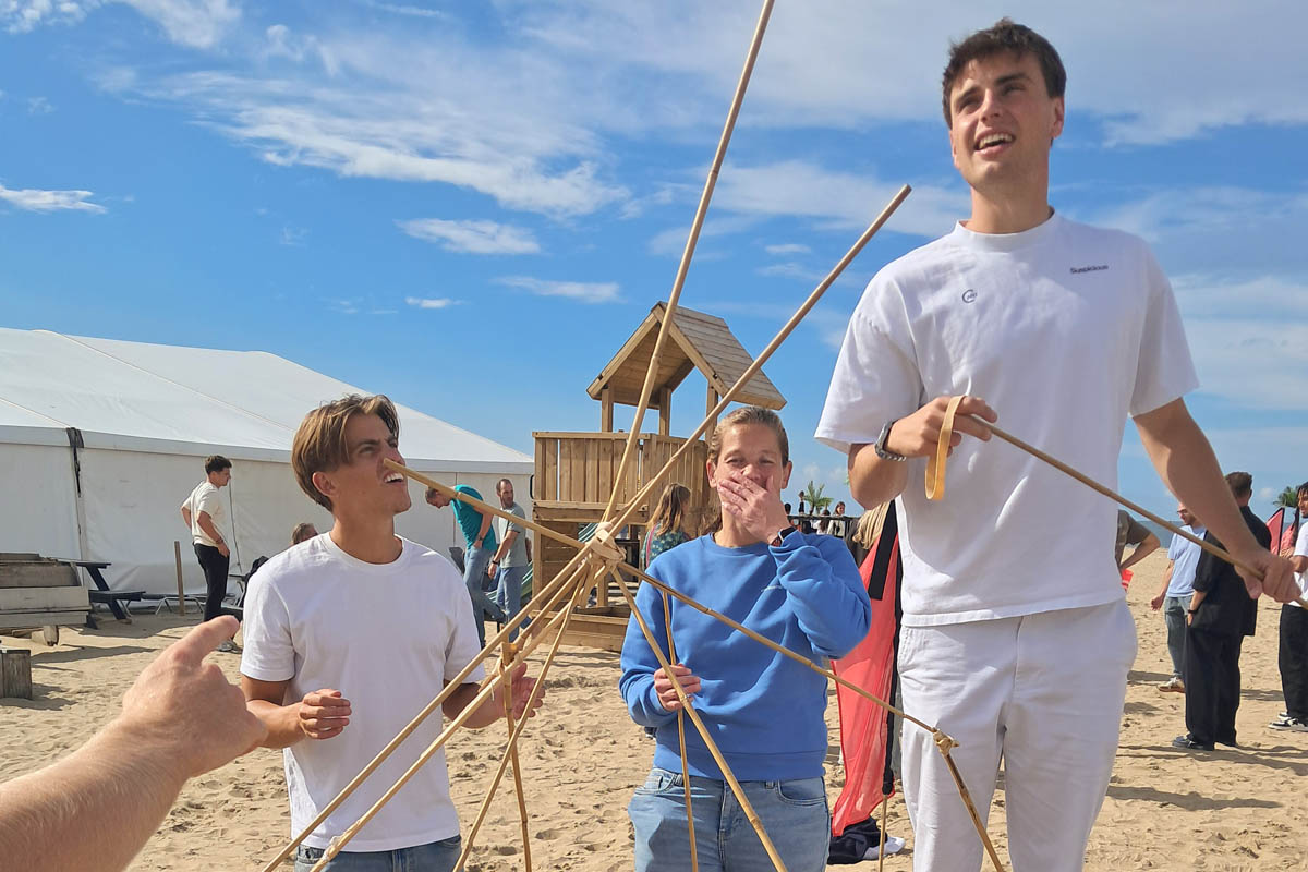 De selecties en staf van zowel de mannen- als vrouwenteams van ADO Den Haag, samen met collega’s van de jeugdopleiding en het kantoorpersoneel, trapten gisteren traditioneel het seizoen af op het Scheveningse strand. Geen bal aan de voet dit keer, maar bamboestokken, katapulten en een flinke dosis fanatisme.